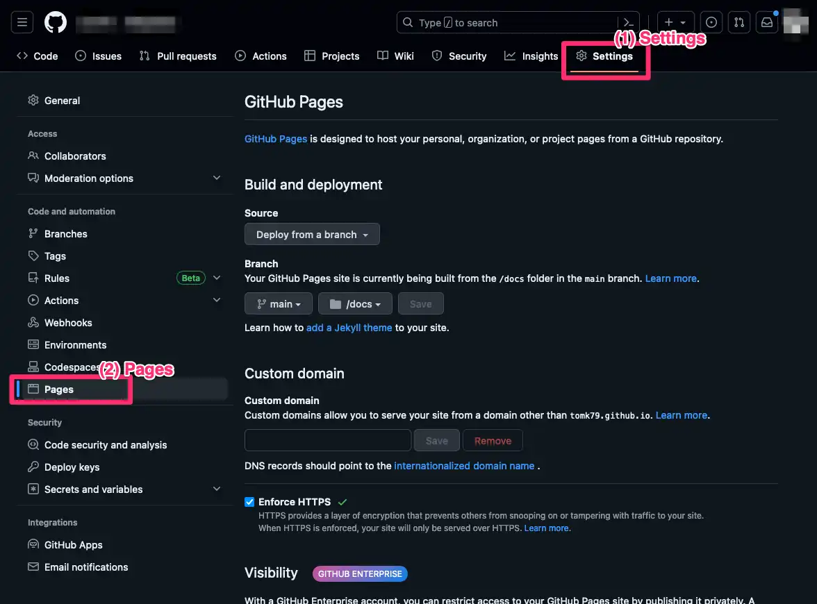 mainブランチの、/docs ディレクトリを公開するように設定する。mainブランチが push されたことをトリガーに、サイトが更新されるようにする。(GitHub Actions を利用しない)参考用に、https://github.com/pickles2/pickles2-for-github-pages に作成したコードを公開しましたので、ご活用ください。