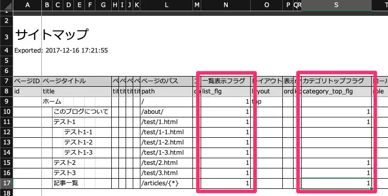 このとき、定義列がセル結合されていることを確認してください。Pickles 2 は、ページタイトル列の定義行が結合された分までが、パンくずの階層を表現しているものとして認識します。
