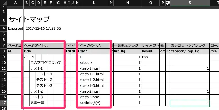 各列には、ページタイトル、パス、階層構造、メタ情報、その他の表示制御のための情報などが定義されています。