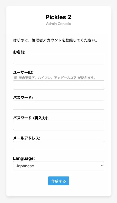 お名前、ユーザーID、パスワード、メールアドレス、使用する言語 を入力して、最初の管理者ユーザーを作成します。